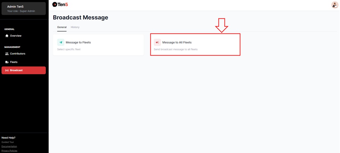 Log in as super admin user and on the left side choose the Broadcast option.
