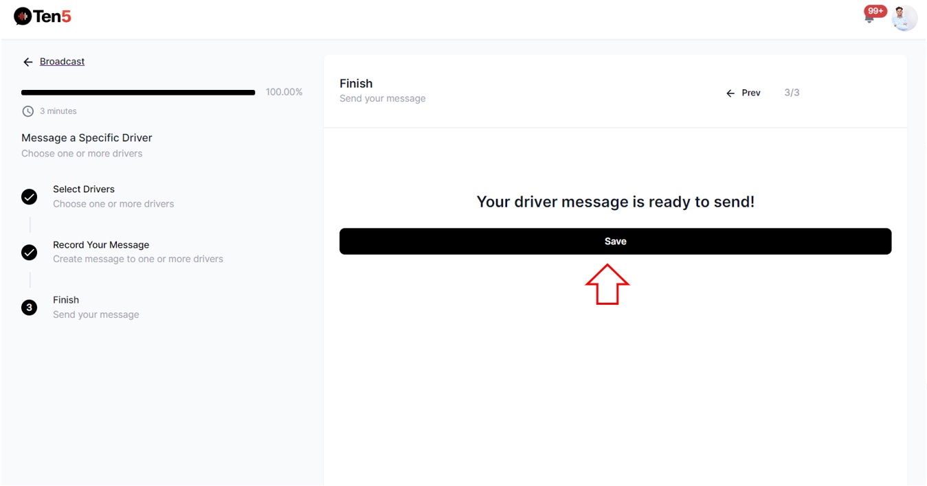 The following page is displayed. Search and select one or more drivers to send the message to. Then click on the Next button to start recording the message.