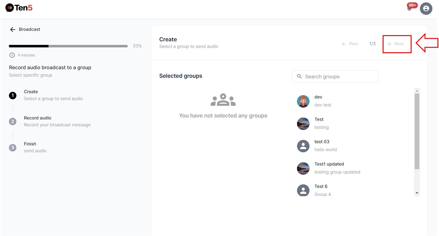 The following page is displayed. Search and select a group to send the message to. Then click on the Next button to start recording the message.