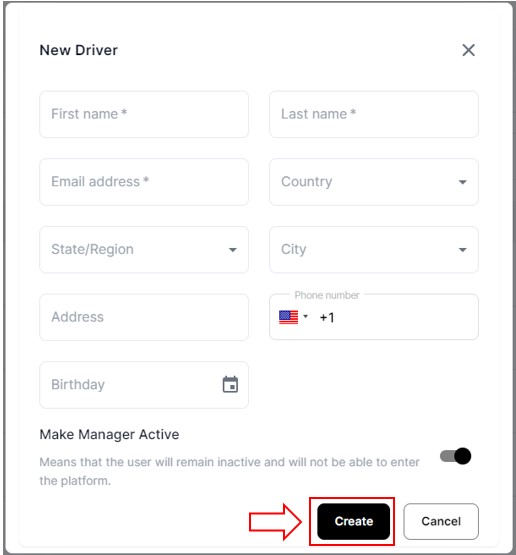 Fill in the data of the driver user. The first name, last name, and email fields are required and finally, click to Create button.