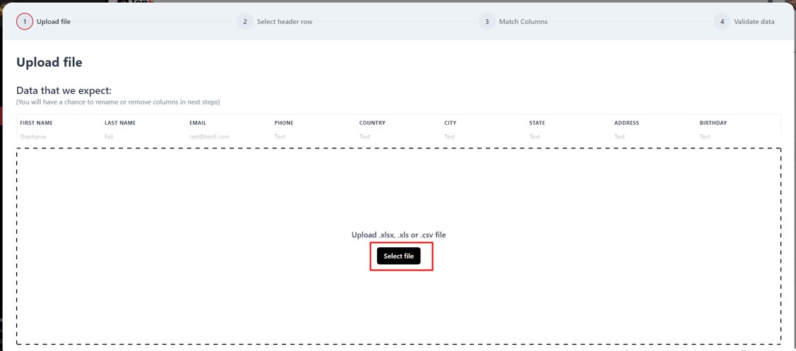 Upload the Excel file with the data of the drivers. Once the Excel file is selected, click on Next button. And continue the steps of the modal.
