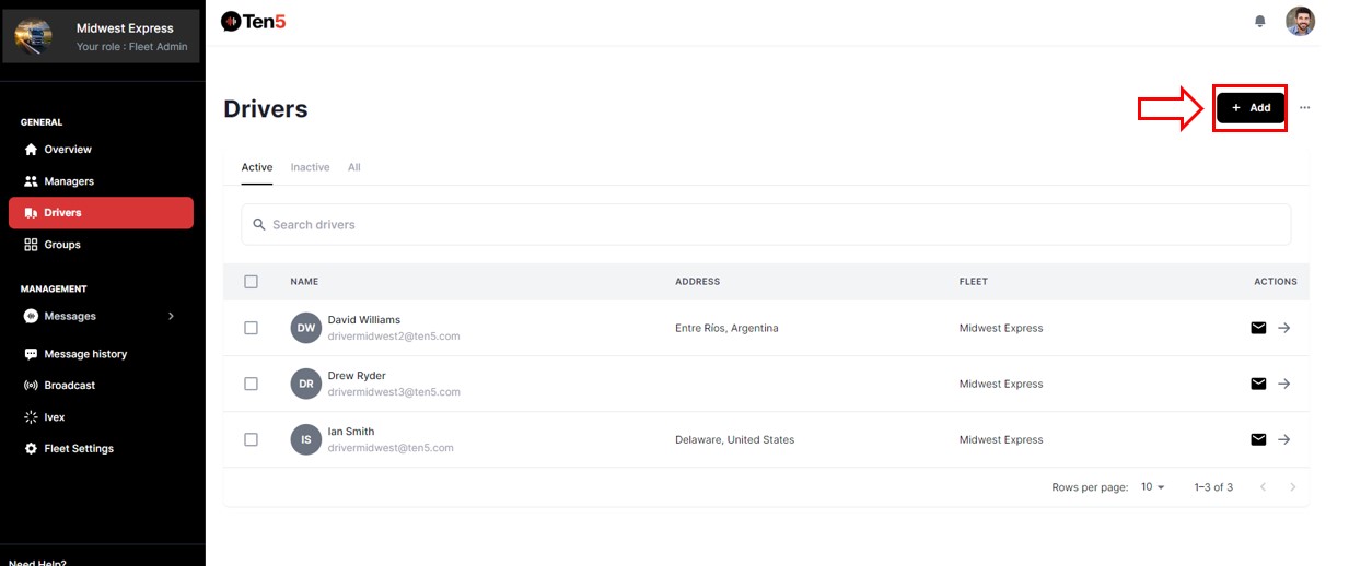 Log in as fleet admin user and on the left side choose the Drivers option. Click in Add button, a modal will be displayed.