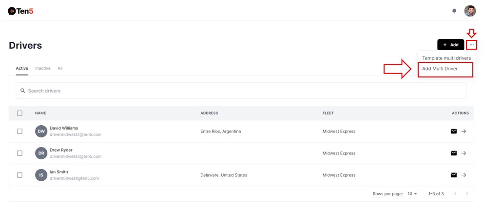 There are two options, the first allows you to download the template to upload various drivers, the second opens the modal to upload the Excel. Click on Add Multi Driver