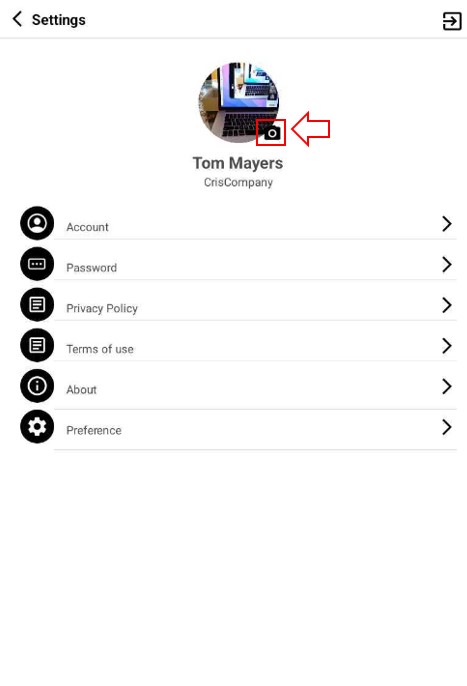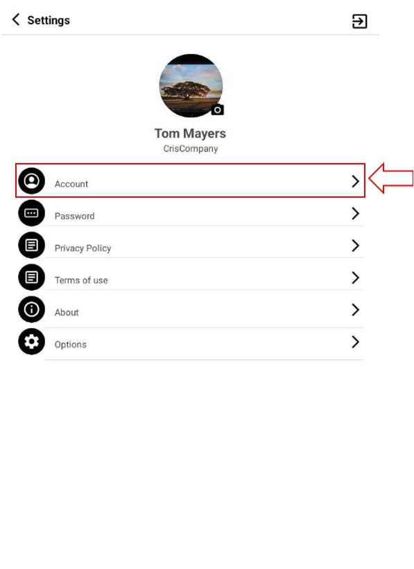 In the settings view you can see your photo, name, company, and some options. To see and change your user information. Select the Account option. Clicking on the arrow or the name.