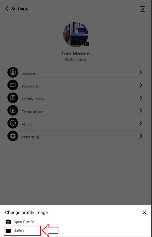 To change the image by selected a photo on your device, select the Gallery option. And select the photo to upload.
