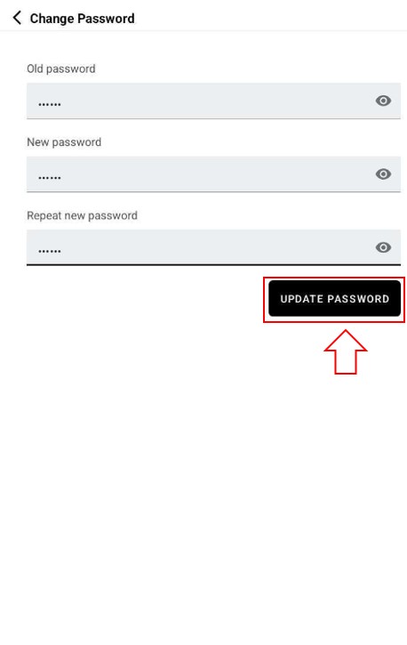 The password change view opens, here you must enter: your old password, your new password and repeat the new one. Once filling the fields, press the UPDATE PASSWORD button.