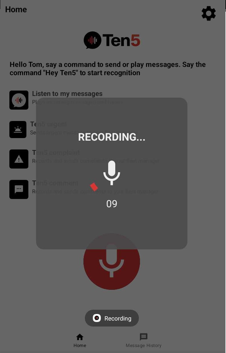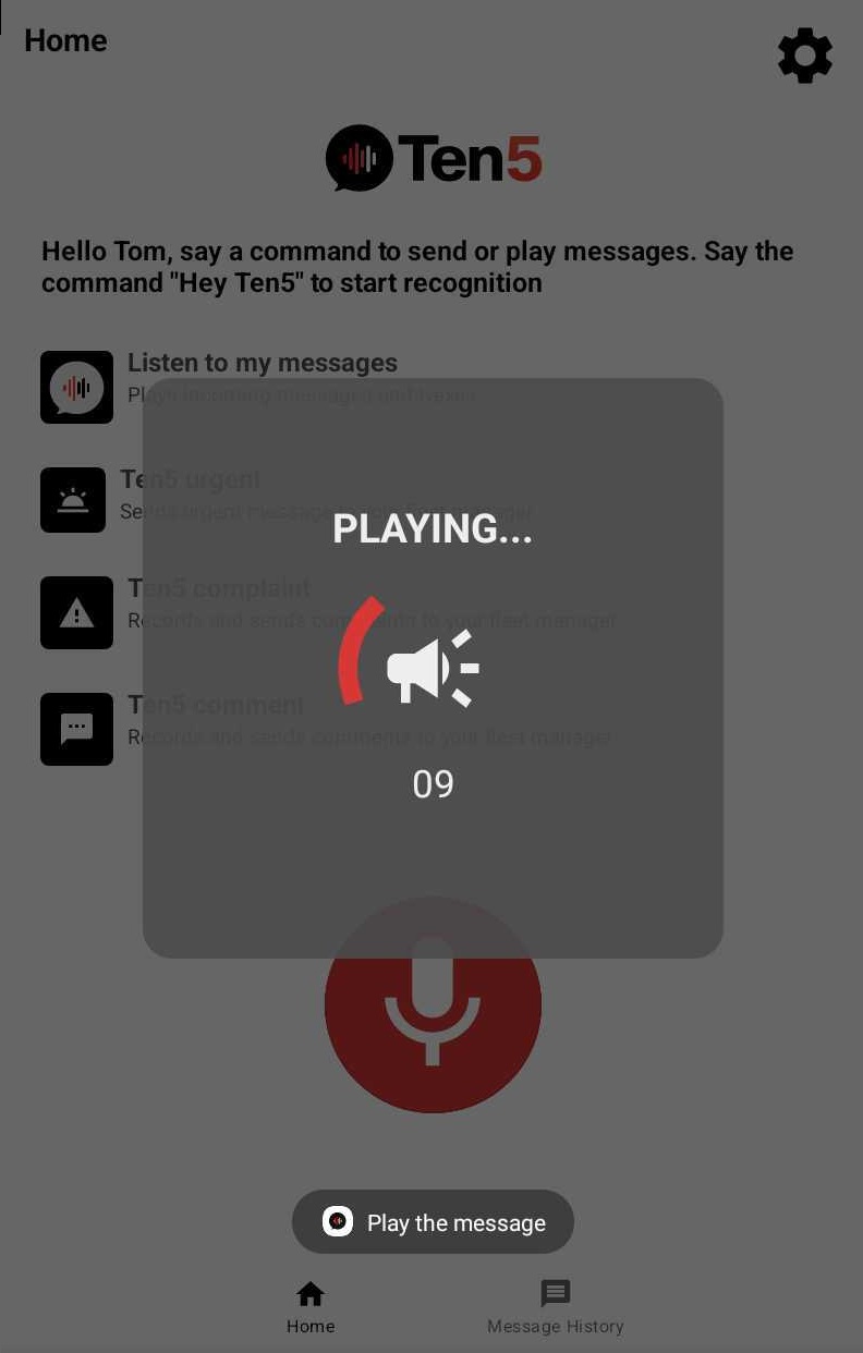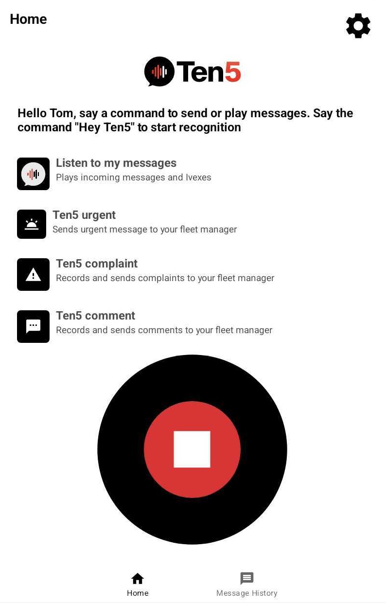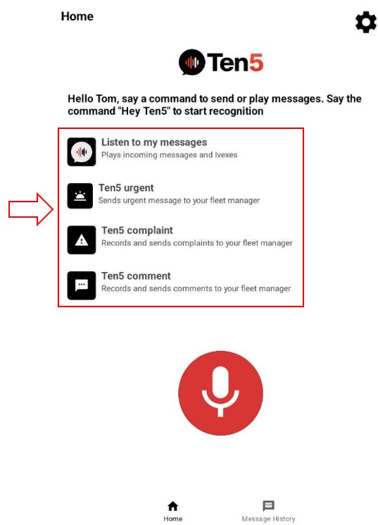 From the app home page, activate the assistant by saying Hey Ten5. When the the microphone icon begins to flash, you can say one of the following commands to record and send a specific type of message: "Urgent", "Comment", or "Complaint". You can also say "Listen to my messages" to hear any new messages that have come in.